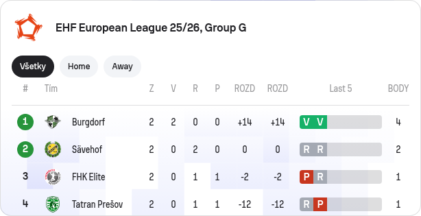 Zaujímavá situácia je po zápasoch 2. kola skupinovej fázy Európskej ligy hádzanárov 2025/2026 v „géčku”. V tejto skupine len jeden tím zatiaľ okúsil chuť víťazstva. Je ním nemecký RECKEN - TSV Hannover-Burgdorf, ktorý zvíťazil v oboch doterajších vystúpeniach. Bundesligista po tesnej výhre v Dánsku na Fredericiou (31:29) zdolal na svojej palubovke pohodlne Tatran Prešov 40:28 (22:15).